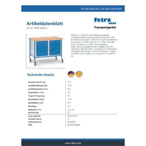 Rolltisch aus Stahlrohr und Profilstahl geschweißt. Schraubkonstruktion pulverbeschichtet in blau RAL 5007. Tischfläche aus Sandwich-Platte 20 mm stark mit Oberfläche Buchendekor. 2 Stahlschränke (B x H x T: 500 x 600 x 600 mm) mit Flügeltür, je 1 fester und 2 verstellbare Böden. Korpus pulverbeschichtet in lichtgrau RAL 7035 und Front in blau RAL 5007. 4 Lenkrollen mit TPE-Bereifung und Naben mit Gleitlager. 2 Stück mit Feststeller. Tragkraft pro Boden 50 kg. Tragkraft pro Fachboden im Schrank 30 kg.