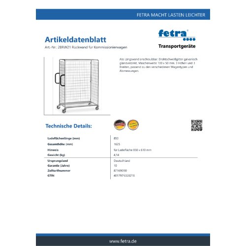 Eigenschaften "FETRA Rückwand L x H 850 x 1625 mm - Zubehör -, 28RW21"