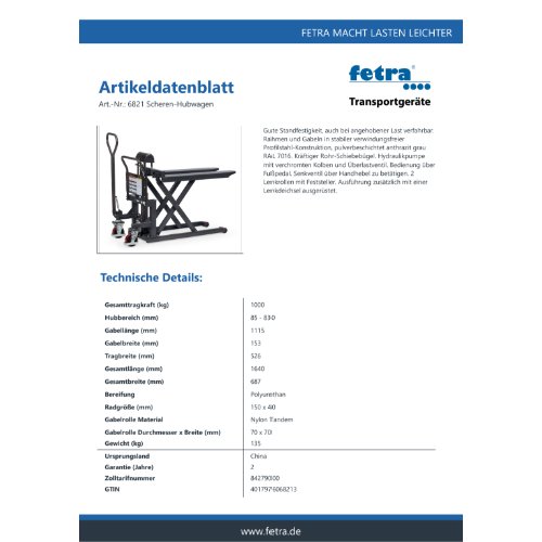 Eigenschaften "FETRA Scheren-Hubwagen 6821 - 1 to., Gabellänge 1115mm"