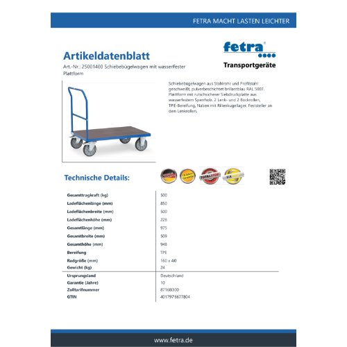 Eigenschaften "FETRA Schiebebügelwagen 25001400 - wasserfeste Plattform"