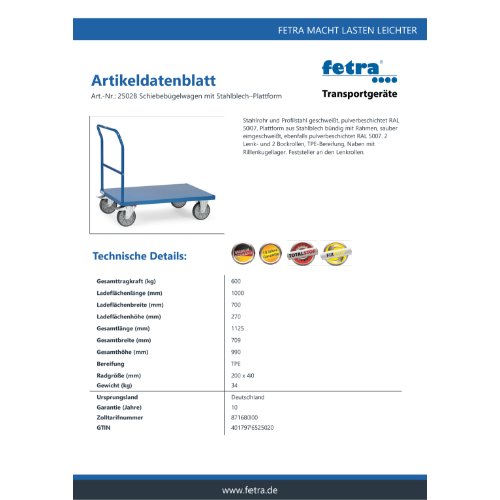 Eigenschaften "FETRA Schiebebügelwagen 2502B - Stahlblech bündig"