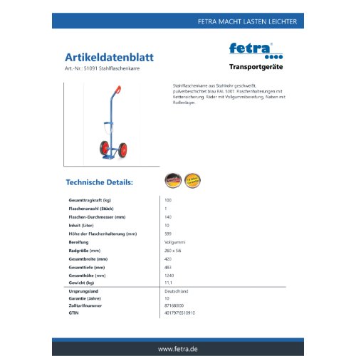 Eigenschaften "FETRA Stahlflaschenkarre 51091"