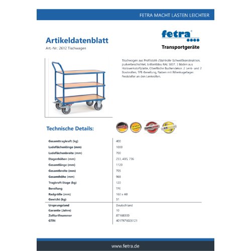 Tischwagen aus Profilstahl-/Stahlrohr-Schweißkonstruktion, pulverbeschichtet, brillantblau RAL 5007. 3 Böden aus Holzwerkstoffplatte, Oberfläche Buchendekor. 2 Lenk- und 2 Bockrollen, TPE-Bereifung, Naben mit Rillenkugellager. Feststeller an den Lenkrollen.