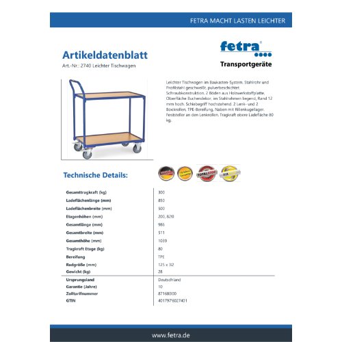 Leichter Tischwagen im Baukasten-System. Stahlrohr und Profilstahl geschweißt, pulverbeschichtet. Schraubkonstruktion. 2 Böden aus Holzwerkstoffplatte, Oberfläche Buchendekor, im Stahlrahmen liegend, Rand 12 mm hoch. Schiebegriff hochstehend. 2 Lenk- und 2 Bockrollen, TPE-Bereifung, Naben mit Rillenkugellager. Feststeller an den Lenkrollen. Tragkraft obere Ladefläche 80 kg.
