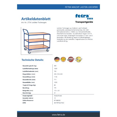 Leichter Tischwagen aus Stahlrohr und Profilstahl geschweißt, pulverbeschichtet brillantblau RAL 5007. Schraubkonstruktion. 3 Böden aus Holzwerkstoffplatte, Oberfläche Buchendekor, im Stahlrahmen liegend mit 12 mm hohen Rand. Schiebegriff hochstehend. 2 Lenk- und 2 Bockrollen, TPE-Bereifung, Naben mit Rillenkugellager. Feststeller an den Lenkrollen. Tragkraft obere und mittlere Ladefläche 80 kg.