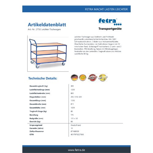 Leichter Tischwagen aus Stahlrohr und Profilstahl geschweißt, pulverbeschichtet brillantblau RAL 5007. Schraubkonstruktion. 3 Böden aus Holzwerkstoffplatte, Oberfläche Buchendekor, im Stahlrahmen liegend mit 12 mm hohen Rand. Schiebegriff hochstehend. 2 Lenk- und 2 Bockrollen, TPE-Bereifung, Naben mit Rillenkugellager. Feststeller an den Lenkrollen. Tragkraft obere und mittlere Ladefläche 80 kg.