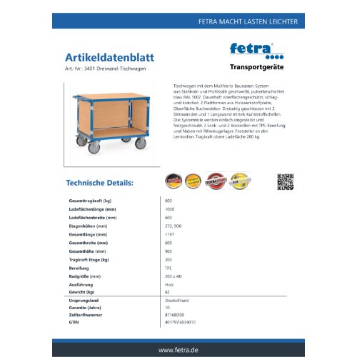 Eigenschaften "FETRA Tischwagen 3401 - mit 3 Wänden"