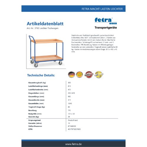 Stahlrohr und Profilstahl geschweißt, pulverbeschichtet brillantblau RAL 5007. Schraubkonstruktion. 2 Kästen aus Holzwerkstoffplatte mit 45 mm hohem Rand, Oberfläche Buchendekor. Schiebegriff hochstehend. 2 Lenk- und 2 Bockrollen, TPE-Bereifung, Naben mit Rillenkugellager. Feststeller an den Lenkrollen. Tragkraft obere Ladefläche 80 kg. Kasten-Innenabmessungen obere Etage: 815 x 455 x 45 mm.