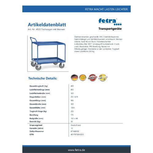Stahlkonstruktion, geschweißt. Mit 2 Stahlblechwannen. Stahlrohrbügel und Stahlblechwannen verschraubt. Wannen öldicht, Rand 40 mm hoch. Pulverbeschichtet brillantblau RAL 5007. Schiebegriff hochstehend. 2 Lenk- und 2 Bockrollen, TPE-Bereifung, Naben mit Rillenkugellager. Feststeller an den Lenkrollen. Tragkraft obere Ladefläche 200 kg.