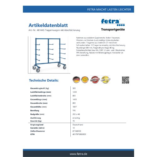 Eigenschaften "FETRA Tragarmwagen mit Abrollsicherung 4614AS"