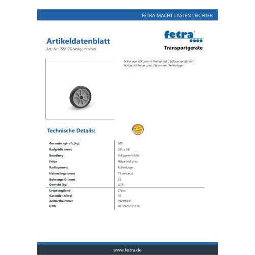 Eigenschaften "FETRA Vollgummirad 260x56 mm - Rille, Rollenlager, 72217G"
