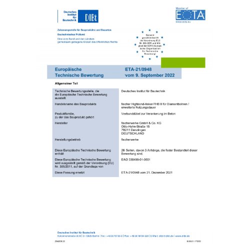 | Gebindeart (Verbundmörtel): | Patronensystem |