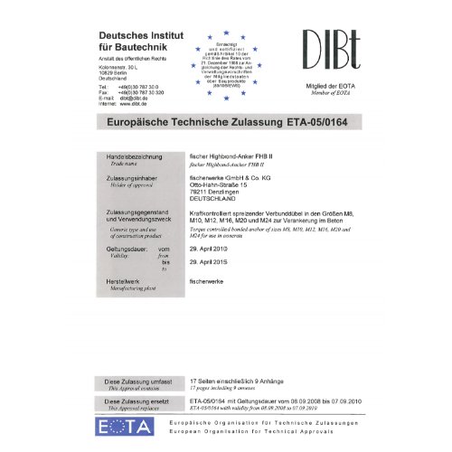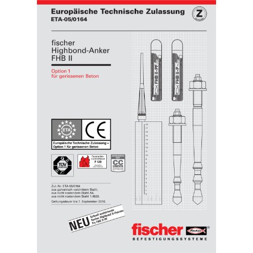 Die fischer Patrone FHB II-P ist eine Systemkomponente des fischer Highbond-Systems FHB II zur Befestigung in ungerissenem und gerissenem Beton. Die Mörtelpatrone enthält einen styrolfreien Vinylestermörtel. Die Mörtelpatrone kann mit den fischer Highbond-Ankerstangen FHB II-A S (Standard), Highbond-Ankerstangen FHB II-A L (lang) aus galvanisch verzinktem Stahl, aus nicht rostendem Stahl und aus hochkorrosionsbeständigem Stahl verwendet werden. Die fischer Highbond-Ankerstangen werden mit dem Setzwerkzeug RA-SDS mit einem Bohrhammer drehend-schlagend gesetzt. Beim Setzvorgang wird die Mörtelpatrone zerstört, durchmischt und aktiviert die Mörtelmasse. Beim Anziehen der Sechskantmutter werden die Konen der Ankerstange in die Mörtelschale gezogen, die sich gegen die Bohrlochwand verspannt. Mit dem fischer Highbond-System FHB II werden Fassaden, Maschinen und Stahlkonstruktionen im Innen- und Außenbereich sicher befestigt.