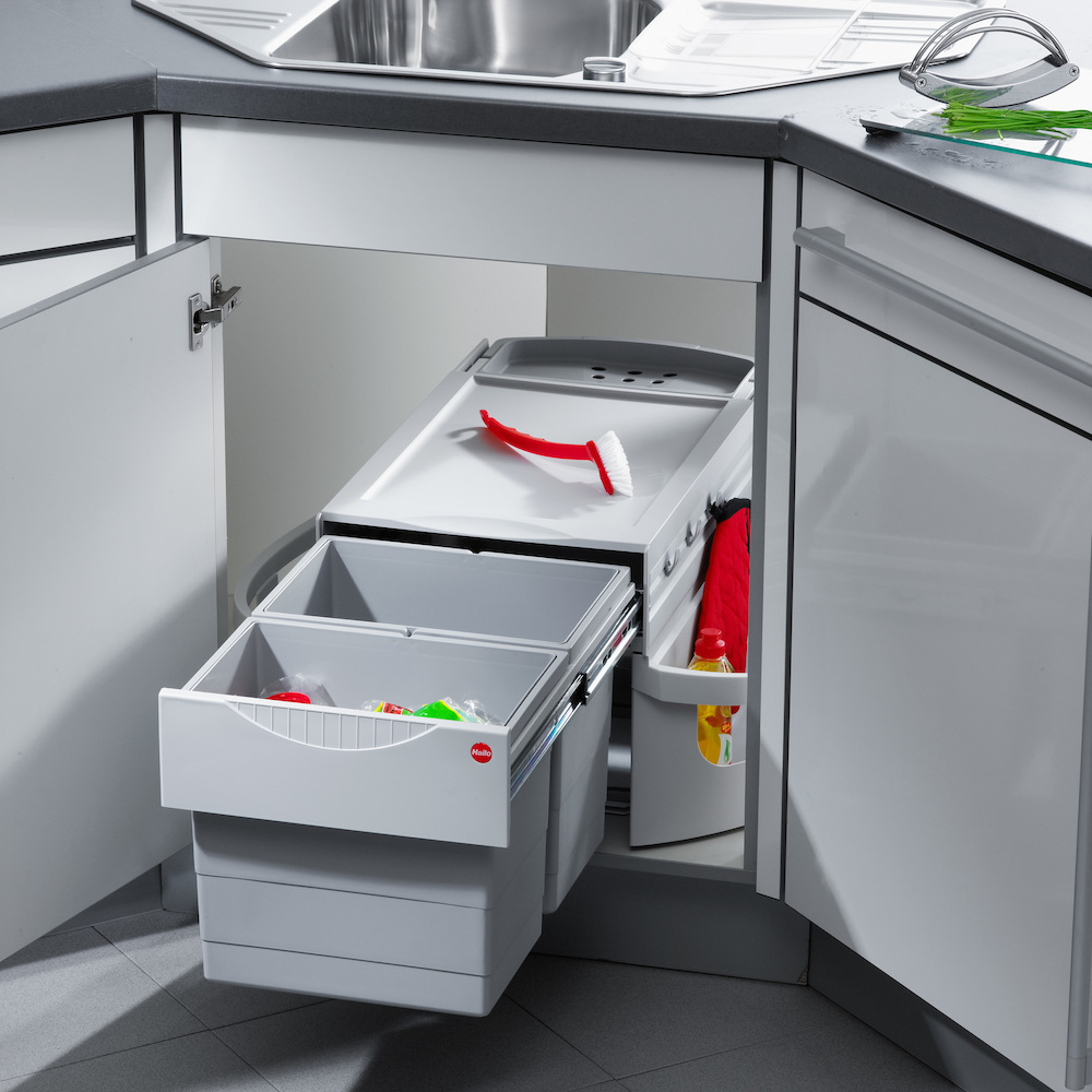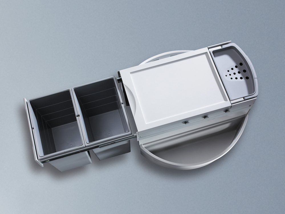 FORMAT Einbauabfallsammler Rondo 3645121; Montage: Bodenmontage; Werkstoff Eimer und Deckel: Kunststoff; Ausführung: mit Systemdeckel,mit Kugelvollauszug,mit verschiebbaren Universalhaken,360° drehbar; Deckel: mit Ablagemulde; Einsatzbereich: Küchen; Fassungsvermögen: 36 l; Setinhalt (Eimer): 2 St.; Basis: Einbauabfallsammler; Korpustiefe: 750 mm; Anwendung: für Eckspülenschrank mit Drehtüren; Inhalt Eimer: 2 x 18 l; Farbton: hellgrau; Form: eckig; Zusatzinformation: mit 2 abnehmbaren Utensilienschalen für Putzmittel,Multifunktionseimer 12 L mit Lochdeckel,Einsatz des Schlauchbrausenabweiser empfohlen; Einbautiefe: 656/700 mm; Einbauhöhe: 351 mm; Einbaubreite: 336 mm; Korpusbreite: 900 mm