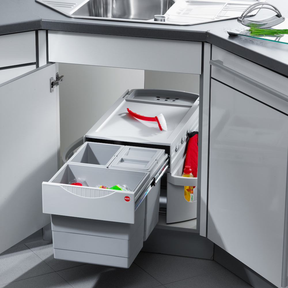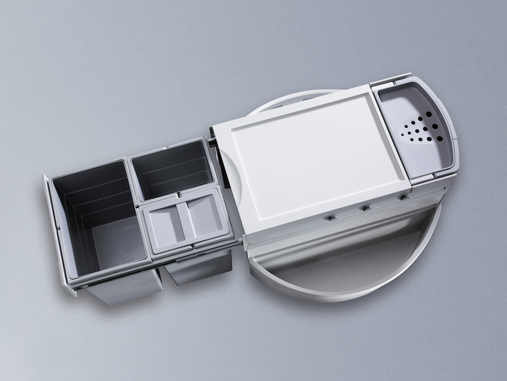 FORMAT Einbauabfallsammler Rondo 3646131; Montage: Bodenmontage; Werkstoff Eimer und Deckel: Kunststoff; Ausführung: mit Systemdeckel,mit Kugelvollauszug,mit verschiebbaren Universalhaken,360° drehbar; Deckel: mit Ablagemulde; Einsatzbereich: Küchen; Fassungsvermögen: 35 l; Setinhalt (Eimer): 3 St.; Basis: Einbauabfallsammler; Korpustiefe: 750 mm; Anwendung: für Eckspülenschrank mit Drehtüren; Inhalt Eimer: 1 x 18 + 2 x 8,5 l; Farbton: hellgrau; Form: eckig; Zusatzinformation: zusätzlich mit 1 Behälterdeckel 8,5 L,mit 2 abnehmbaren Utensilienschalen für Putzmittel,Multifunktionseimer 12 L mit Lochdeckel,Einsatz des Schlauchbrausenabweiser empfohlen; Einbautiefe: 656/700 mm; Einbauhöhe: 351 mm; Einbaubreite: 336 mm; Korpusbreite: 900 mm