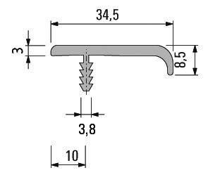 FORMAT Griffleiste H; Montage: Harpunensteg wird in die Nut gepresst; Ausführung: mit Harpunensteg; Material: Aluminium; Einsatzbereich: Möbel; Farbton: silber; Breite: 34,5 mm; Länge: 2.500 mm; Höhe: 8,5 mm; Oberfläche: eloxiert; Basis: Griffleiste; Für Plattenstärke: 19 mm; Nutbreite: 3,5 mm; Stärke: 3 mm