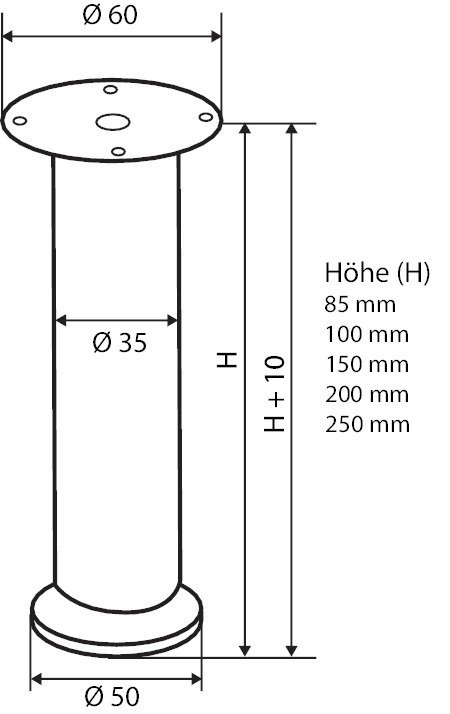 FORMAT Möbelfuß Joti; Ausführung: höhenverstellbar,Rundrohr; Werkstoff: Stahl; Einsatzbereich: Unterbau; Farbton: aluminiumfarbig; Länge: 100 mm; Durchmesser: 35 mm; Höhenverstellung: 10 mm; Basis: Möbelfuß; Befestigungsart: zum Anschrauben; Durchmesser Befestigungsplatte: 60 mm; Werkstoff Befestigungsplatte: Stahl; Ø Fußplatte: 50 mm