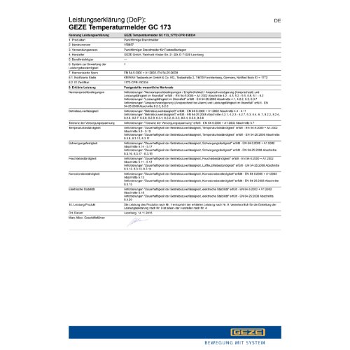 Eigenschaften "Geze Funktemperaturmelder, für Feststellanlage, GC 173, Kunststoff, RAL 9016"