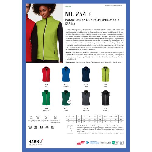 Leichte, atmungsaktive, strapazierfähige Softshellweste für Damen, mit wasser- und winddichtem Softshellobermaterial, Teilungsnähten auf Vorder- und Rückenteil für perfekte Passform, hochwertigem Zwei-Wege-Frontreißverschluss mit innenliegender Windschutzpatte, Reißverschlussgarage und Reflexpaspel, seitlichen Reißverschlusstaschen mit Reflexapplikation und reflektierender Druckgrafik am verlängerten, abgerundeten Rückenteil, weitenverstellbarem Saumabschluss mit Tunnelkordelzug und Stoppern. Alle Click-down-Reißverschlüsse von YKK®. Hergestellt aus leichtem, dehnfähigem Softshell-Material für exzellente Bewegungsfreiheit aus Interlock-2-Lagen-Laminat mit TRIACTIVE® PRO Technologie. Gedrucktes HAKRO Necklabel für höchsten Tragekomfort und gewebtes HAKRO Flaglabel an der linken Seitennaht.