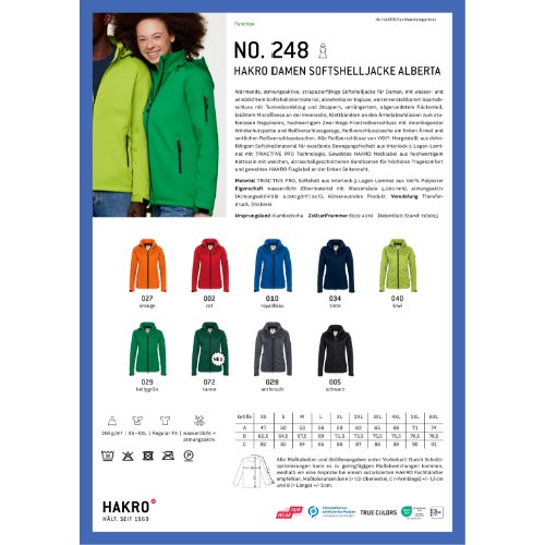 Wärmende, atmungsaktive, strapazierfähige Softshelljacke für Damen, mit wasser- und winddichtem Softshell-Obermaterial, abnehmbarer Kapuze, weitenverstellbarem Saumabschluss mit Tunnelkordelzug und Stoppern, verlängertem, abgerundetem Rückenteil, leichtem Microfleece an der Innenseite, Klettbändern an den Ärmelabschlüssen zum stufenlosen Regulieren, hochwertigem Zwei-Wege-Frontreißverschluss mit innenliegender Windschutzpatte und Reißverschlussgarage, Reißverschlusstasche am linken Ärmel und seitlichen Reißverschlusstaschen. Alle Reißverschlüsse von YKK®. Hergestellt aus dehnfähigem Softshell-Material für exzellente Bewegungsfreiheit aus Interlock-3-Lagen-Laminat mit TRIACTIVE® PRO Technologie. Gewebtes HAKRO Necklabel aus hochwertigem Kettsatin mit weichen, ultraschallgeschnittenen Bandkanten für höchsten Tragekomfort und gewebtes HAKRO Flaglabel an der linken Seitennaht.