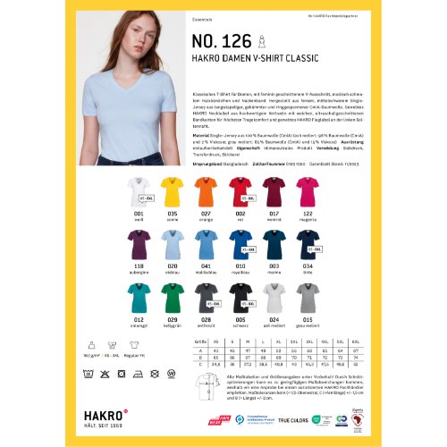 Klassisches T-Shirt für Damen, mit feminin geschnittenem V-Ausschnitt, modisch schmalem Halsbündchen und Nackenband. Hergestellt aus feinem, mittelschwerem Single-Jersey aus langstapeliger, gekämmter und ringgesponnener CmiA-Baumwolle. Gewebtes HAKRO Necklabel aus hochwertigem Kettsatin mit weichen, ultraschallgeschnittenen Bandkanten für höchsten Tragekomfort und gewebtes HAKRO Flaglabel an der linken Seitennaht.