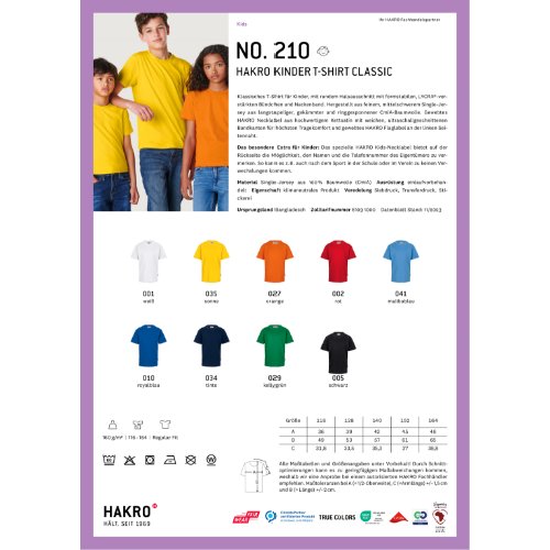 Klassisches T-Shirt für Kinder, mit rundem Halsausschnitt mit formstabilen, LYCRA®-verstärkten Bündchen und Nackenband. Hergestellt aus feinem, mittelschwerem Single-Jersey aus langstapeliger, gekämmter und ringgesponnener CmiA-Baumwolle. Gewebtes HAKRO Necklabel aus hochwertigem Kettsatin mit weichen, ultraschallgeschnittenen Bandkanten für höchsten Tragekomfort und gewebtes HAKRO Flaglabel an der linken Seitennaht.