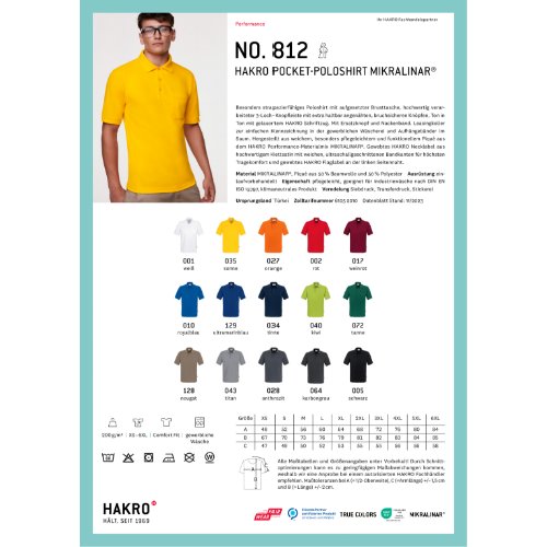 Besonders strapazierfähiges Poloshirt mit aufgesetzter Brusttasche, hochwertig verarbeiteter 3-Loch-Knopfleiste mit extra haltbar angenähten, bruchsicheren Knöpfen, Ton in Ton mit gelasertem HAKRO Schriftzug. Mit Ersatzknopf und Nackenband. Leasingkoller zur einfachen Kennzeichnung in der gewerblichen Wäscherei und Aufhängebänder im Saum. Hergestellt aus weichem, besonders pflegeleichtem und funktionellem Piqué aus dem HAKRO Performance-Materialmix MIKRALINAR®. Gewebtes HAKRO Necklabel aus hochwertigem Kettsatin mit weichen, ultraschallgeschnittenen Bandkanten für höchsten Tragekomfort und gewebtes HAKRO Flaglabel an der linken Seitennaht.