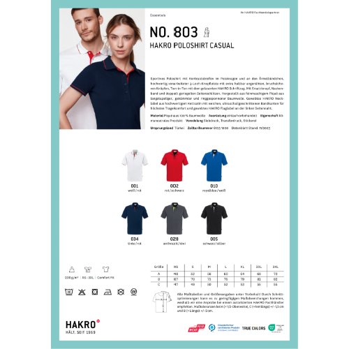 Sportives Poloshirt mit Kontraststreifen im Polokragen und an den Ärmelbündchen, hochwertig verarbeiteter 3-Loch-Knopfleiste mit extra haltbar angenähten, bruchsicheren Knöpfen, Ton in Ton mit gelasertem HAKRO Schriftzug. Mit Ersatzknopf, Nackenband und doppelt geriegelten Seitenschlitzen. Hergestellt aus feinmaschigem Piqué aus langstapeliger, gekämmter und ringgesponnener Baumwolle. Gewebtes HAKRO Necklabel aus hochwertigem Kettsatin mit weichen, ultraschallgeschnittenen Bandkanten für höchsten Tragekomfort und gewebtes HAKRO Flaglabel an der linken Seitennaht.