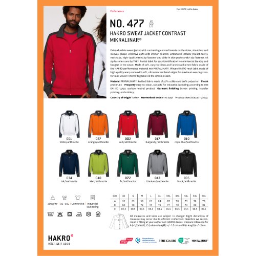 Besonders strapazierfähige Sweatjacke mit kontrastfarbigen Einsätzen an den Seiten, Schultern und Ärmeln, formstabilen Bündchen mit LYCRA®-Anteil, nicht angerauter Innenseite (French-Terry), Nackenband, hochwertigem Frontreißverschluss und seitlichen Einschubtaschen mit Reißverschluss. Alle Reißverschlüsse von YKK®. Leasingkoller zur einfachen Kennzeichnung in der gewerblichen Wäscherei und Aufhängebänder im Saum. Hergestellt aus weicher, besonders pflegeleichter und funktioneller Maschenware aus dem HAKRO Performance-Materialmix MIKRALINAR®. Gewebtes HAKRO Necklabel aus hochwertigem Kettsatin mit weichen, ultraschallgeschnittenen Bandkanten für höchsten Tragekomfort und gewebtes HAKRO Flaglabel an der linken Seitennaht.