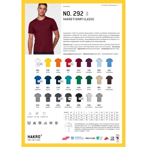 Klassisches T-Shirt mit rundem Halsausschnitt, LYCRA®-verstärktem Halsbündchen und Nackenband. Hergestellt aus feinem, mittelschwerem Single-Jersey aus langstapeliger, gekämmter und ringgesponnener CmiA-Baumwolle. Gewebtes HAKRO Necklabel aus hochwertigem Kettsatin mit weichen, ultraschallgeschnittenen Bandkanten für höchsten Tragekomfort und gewebtes HAKRO Flaglabel an der linken Seitennaht.
