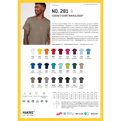 Besonders strapazierfähiges T-Shirt mit rundem Halsausschnitt, geripptem Halsbündchen und Nackenband. Leasingkoller zur einfachen Kennzeichnung in der gewerblichen Wäscherei und Aufhängebänder im Saum. Hergestellt aus weichem, besonders pflegeleichtem und funktionellem, mittelschweren Single-Jersey aus dem HAKRO Performance-Materialmix MIKRALINAR®. Gewebtes HAKRO Necklabel aus hochwertigem Kettsatin mit weichen, ultraschallgeschnittenen Bandkanten für höchsten Tragekomfort und gewebtes HAKRO Flaglabel an der linken Seitennaht. • Material: MIKRALINAR®, Single-Jersey aus 50 % Baumwolle und 50 % Polyester • Gewicht: 160 g/m² • Ausrüstung: einlaufvorbehandelt • Eigenschaft: pflegeleicht, geeignet für die Industriewäsche nach ISO 15797, klimaneutrales Produkt • Passform: Comfort Fit • Zertifikate: Fair Wear, Climate Partner, OEKO-TEX® STANDARD 100 • Waschtemperatur: 60 °C • Größen: XS-6XL