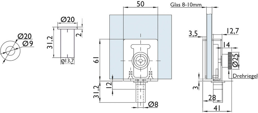 Glastür-Feststeller-Set bestehend aus 1 Stück Glastürfeststeller Aufnahmebuchse mit Federverschluss 1 Innensechskantschlüsel SW 2,5 Oberfl. 60 (Edelstahl matt) mit 4 Gummiunterlagen: 2 x 1 mm für 10 mm Glasstärke 2 x 2 mm für 8 mm Glasstärke