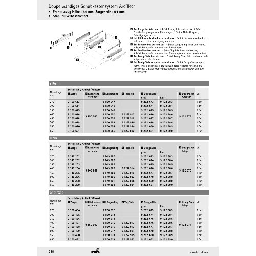 Eigenschaften "Hettich DesignSide Adapter ArciTech, 92 mm, System- / Zargenhöhe 186/ 94, 218/126, silber"