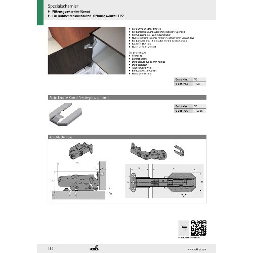 Eigenschaften "Hettich Führungsscharnier Kamat, Für Kühlschrankumbauten, Öffnungswinkel 115°"