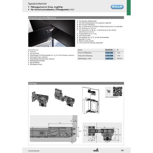 Eigenschaften "Hettich Führungsscharnier mit Traglast Evisys ohne Dämpfung"