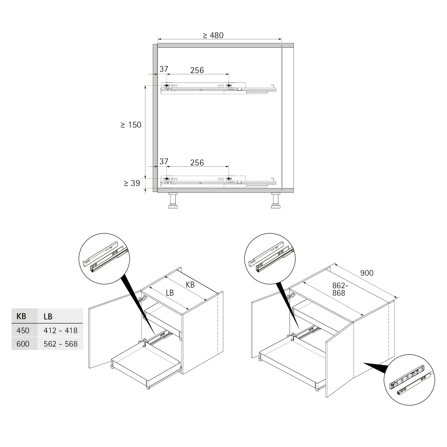 • Für Schrankbreite 450, 600 oder 900 mm