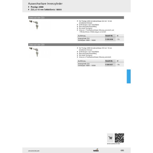 233283, 4023149043932, 9105927, Hettich, Innenzylinder, Z23, Zylinder, Innenzylinder Z23 18051 - 18100,Mechanische Möbelschließsysteme, Auswechselbare Innenzylinder Prestige 2000, ø 18 mm Schließkreis 18000