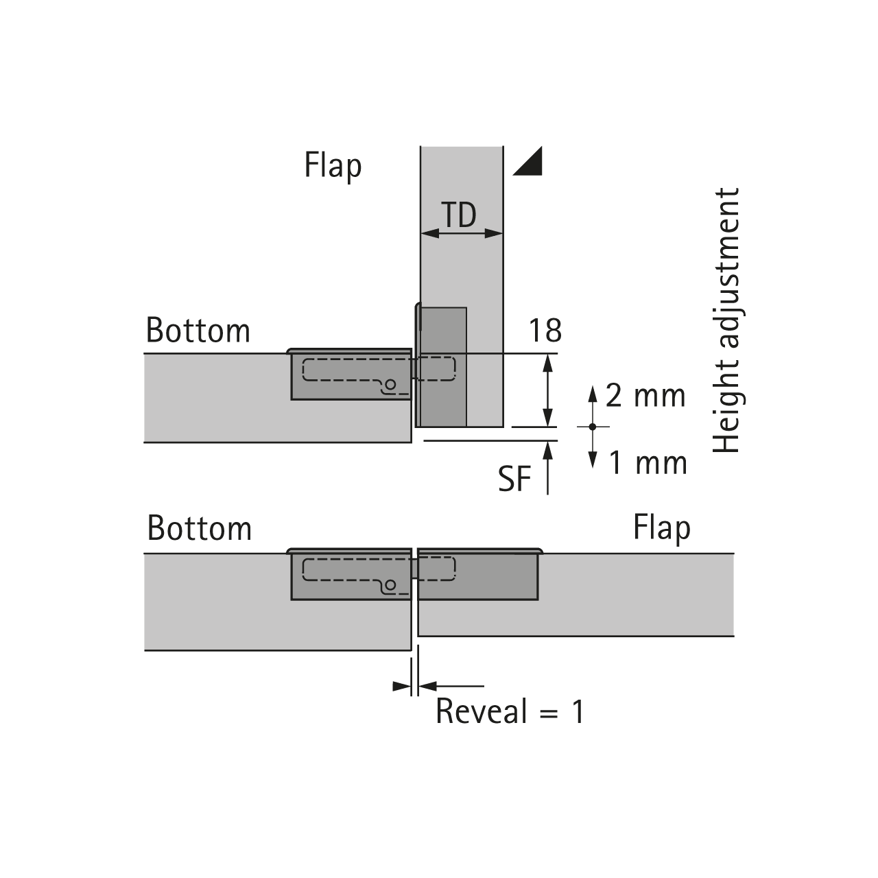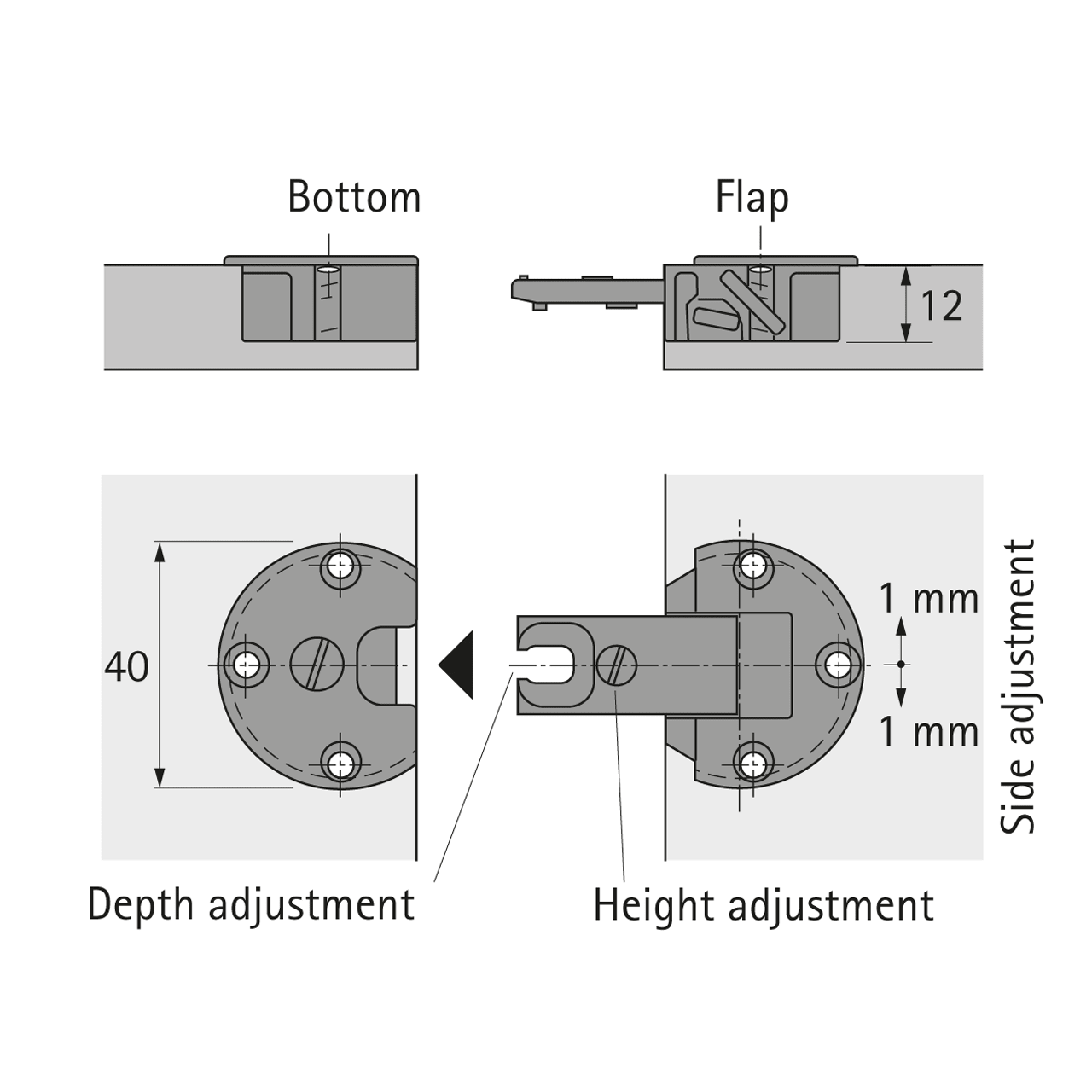 • Ausrichten der Klappe durch Höhen-, Seiten- und Tiefenverstellung