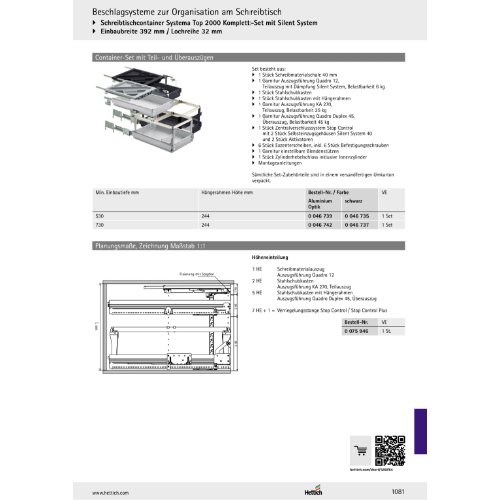 Eigenschaften "Hettich Konstruktionszeichnung: Schreibtischcontainer Einbaubreite: 392 mm, Einbautiefe: 530 / 730 mm"