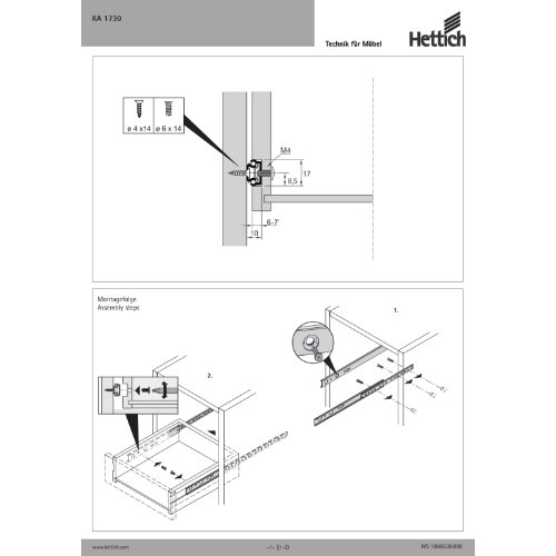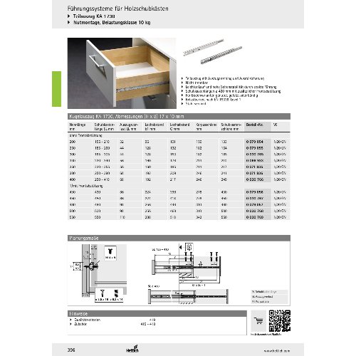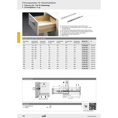 Eigenschaften "Hettich Kugelauszug KA 1730, Nutmontage, Abmessungen (H x B) 17 x 10 mm, Länge 450 mm"