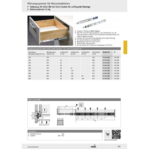 Eigenschaften "Hettich Kugelauszug KA 4532 AM mit Silent System, Aufliegende Montage, Abmessungen (H x B) 46 x 12,7 mm, 450"
