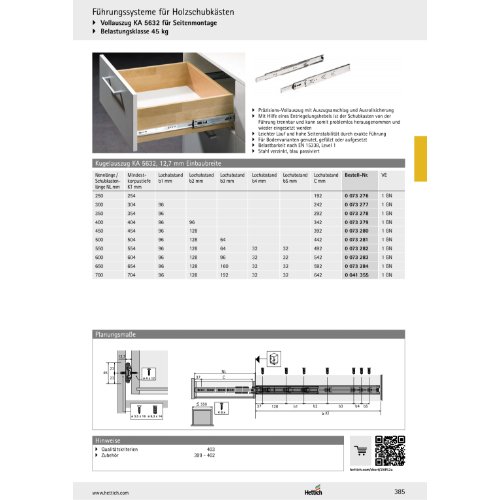 | Variante: | HETTICH Kugelauszug KA 5632, Seitenmontage, Abmessungen (H x B) 46 x 12,7 mm, 500 mm, blau passiviert, verzinkt |