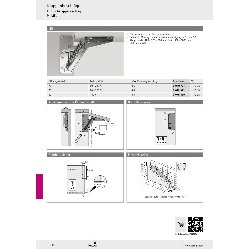 Eigenschaften "Hettich Lift, 80 - 220 N, 4.6 kg, 90°"
