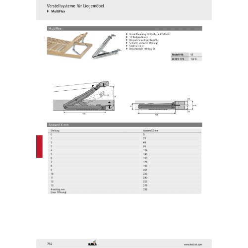 • Verstellbeschlag für Kopf- und Fußteile<br />• 13 Rastpositionen<br />• Besonders niedrige Bauhöhe<br />• Schnelle, einfache Montage<br />• Stahl verzinkt<br />• Belastbarkeit 140 kg / St.<br /><br /><ul><li><a href="https://e.video-cdn.net/video?video-id=2ZM3BgmDaZJxM-rBoAWg-s&player-id=FTQMjhjfXuXJAjTXSPRWF2" target="_blank" rel="noreferrer noopener">MultiFlex Verstellbeschlag für Kopf- und Fußteile</a></li><li><a href="https://web2.hettich.com/hbh/addon/cad/25173_3d.zip" target="_blank" rel="noreferrer noopener">Artikeldaten 2D/3D (DWG/DXF)</a></li><li><a href="https://hettich-embedded.partcommunity.com?info=hettich/connecting_technology/adjustment_system_seating/adjustable_fitting/multiflex.prj&varset=%7BARTICLENO=25173%7D&encoding=%25" target="_blank" rel="noreferrer noopener">Hettich CAD</a></li><li><a href="https://catalog.hettich.com/General/TA_2023/de_DE/index.html?catalog=TA_2023_de_DE&startpage=782" target="_blank" rel="noreferrer noopener">Blätterkatalog</a></li></ul><br /><br /><b>Angaben gemäß Produktsicherheitsverordnung ((EU) 2023/998):</b><br />Hersteller: Hettich Marketing- und Vertriebs GmbH & Co. KG<br /><p><span style="color:rgb(91,93,98);font-family:'Open Sans', tahoma, arial, sans-serif;font-size:14px;background-color:rgb(255,255,255);">Anton-Hettich-Straße 12-16<br />32278 Kirchlengern / Germany</span><br /><br /><span style="color:rgb(91,93,98);font-family:'Open Sans', tahoma, arial, sans-serif;font-size:14px;background-color:rgb(255,255,255);">Telefon: +49 5733 / 798 - 0<br />eMail: </span><a href="mailto:info@hettich.com" style="color:rgb(0,0,0);font-family:'Open Sans', tahoma, arial, sans-serif;font-size:14px;background-color:transparent;">info@hettich.com</a><br /><span style="color:rgb(91,93,98);font-family:'Open Sans', tahoma, arial, sans-serif;font-size:14px;background-color:rgb(255,255,255);">Web: </span><a href="https://www.hettich.com/" target="_blank" style="color:rgb(0,0,0);font-family:'Open Sans', tahoma, arial, sans-serif;font-size:14px;background-color:transparent;" rel="noreferrer noopener">www.hettich.com</a></p><br />
