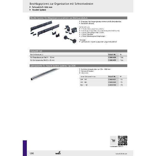 | Variante: | HETTICH Parallel System für Hängeregistraturrahmen und Breitwandschub, Für Endlosbauweise Maß X = 22 mm, Hettich Parallel System für Hängeregistraturrahmen und Breitwandschub, Für Endlosbauweise Maß X = 22 mm |