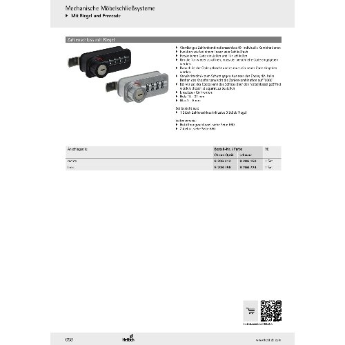Eigenschaften "Hettich Zahlenschloss mit Riegel und Freecode, rechts, Chrom Optik"