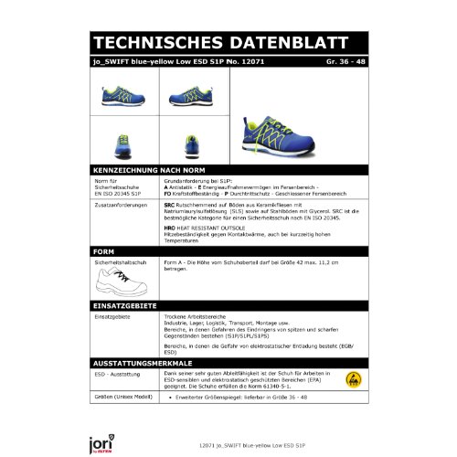Eigenschaften "JORI Sicherheitshalbschuh jo_SWIFT blue-yellow Low ESD S1P, Gr. 38"