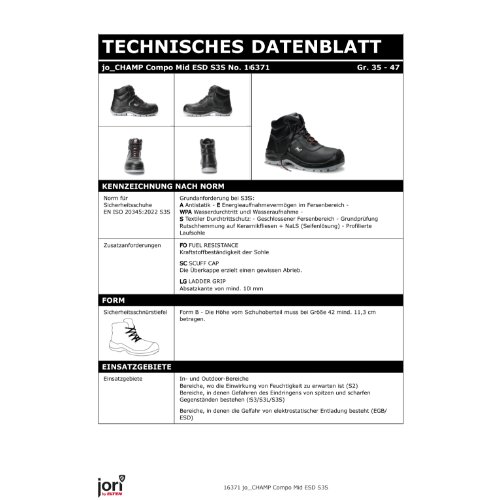 Sicherheitsschnürstiefel, jo_CHAMP Compo Mid ESD S3S, 16371-35, JORI Professional, Obermaterial: Rindleder, Atmungsaktives Textilfutter, Geschlossene, gepolsterte Lasche, Ganzflächige Einlegesohle jo_TITAN ESD, PU/PU Sohle jo_EXPLORE, Kunststoffkappe, EN ISO 20345:2022 S3S FO/SC/LG, Form B