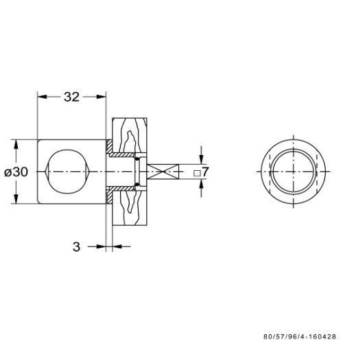 3553 Griffolive drehbar, ø 30 mm, 2Griffmulden, für alle Anschlagrichtungenverwendbar, Metall vernickelt, 7 mmVierkantstift, für ø 18 mm Bohrung,für 16 - 26 mm Materialstärke