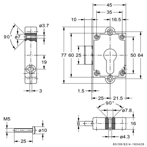7407 PZ Riegelschloss, für Profilzylinder,aufliegend, Dornmaß 25 mm, Metallvernickelt, rechts und links verwendbar,Zylinder axial verstellbar, Zylinderbefestigungdurch Schraube, mit Anschraubösen fürSchlüsselschilder
